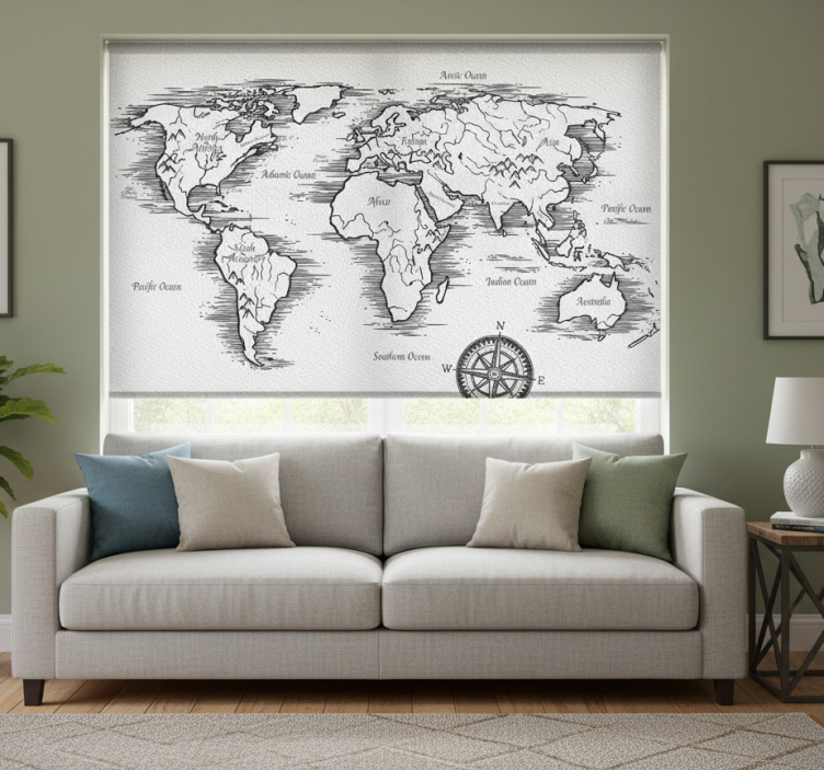 Wit rolgordijn met elegante wereldkaarttekening