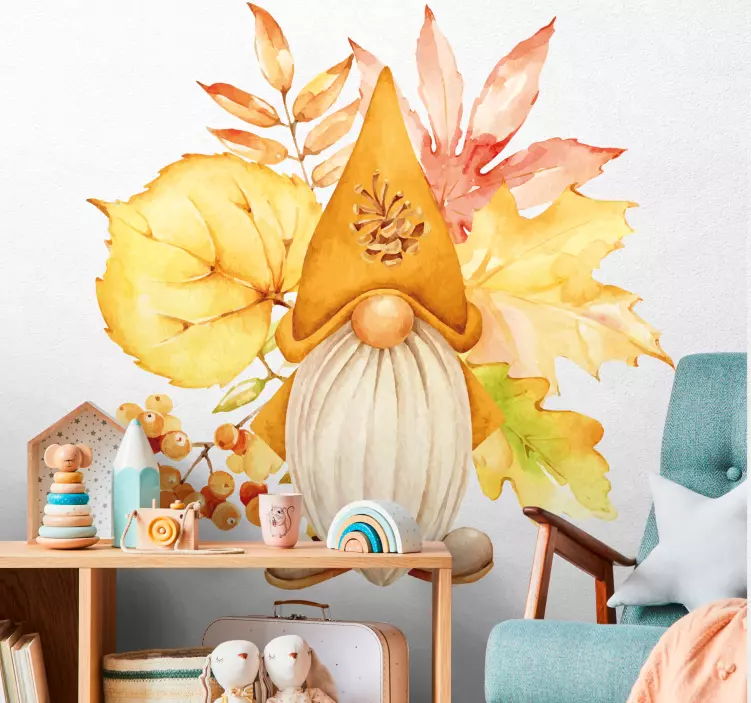 Breng een vleugje magie in uw huis met onze Decoratie sticker herfstgnom figuur. Dit prachtige ontwerp toont een kabouter die zich omringd voelt door de warme kleuren van de herfst, met waterverf die de schoonheid van bladeren en de natuur vastlegt. Dit is de perfecte manier om de val in uw interieur te verwelkomen!