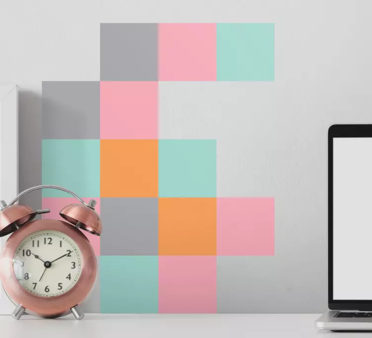 Breng kleur en creativiteit in uw interieur met onze decoratie sticker kleurrijke geometrische compositie. Dit unieke ontwerp bestaat uit abstracte en moderne vormen die perfect in vierkanten zijn georganiseerd, waardoor het een visueel spektakel is dat elke ruimte opvrolijkt. De combinatie van levendige kleuren en geometrische patronen creëert een dynamische sfeer die zowel stijlvol als inspirerend is.