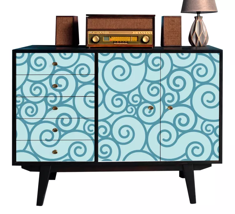 De decoratie sticker met krullend patroon accent biedt een prachtig grafisch ontwerp dat abstracte golfvormen en elegante wervelingen combineert. Dit geometrische patroon in diepe blauwtinten voegt een decoratieve flair toe aan uw meubilair, waardoor elke ruimte een unieke uitstraling krijgt. De stijlvolle en verfijnde uitstraling van deze sticker zorgt ervoor dat uw interieur opvalt en een gevoel van harmonie creëert.