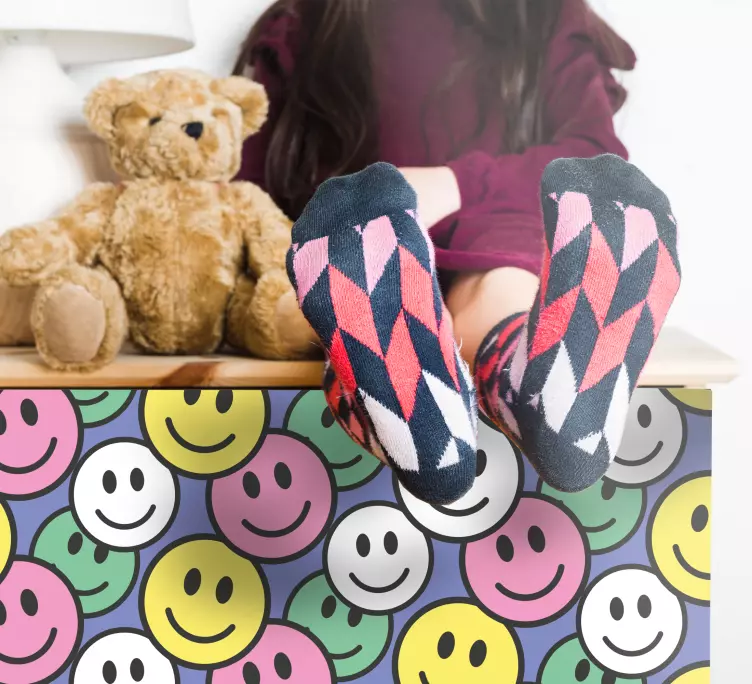 Referentienummer: A49043Een vrolijke compositie met smiley-gezichten die in een levendig patroon zijn gerangschikt, waardoor een sfeer van vreugde en positiviteit ontstaat. De mix van felle kleuren versterkt de speelse aard van dit ontwerp, waardoor het ideaal is voor een kindvriendelijke omgeving.