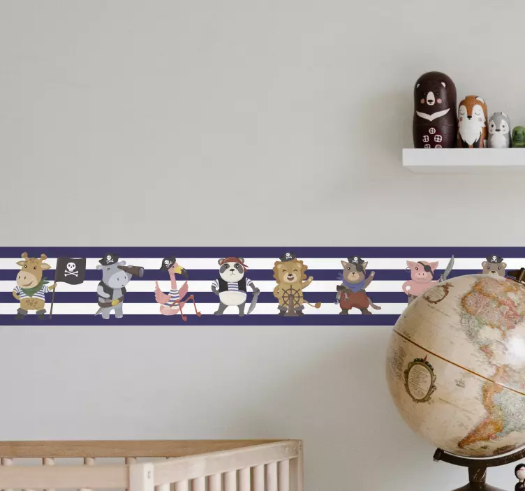 Referentienummer: A47219Een levendige verzameling van piratenthema dierenpersonages die in speelse houdingen zijn weergegeven. Elk dier draagt verschillende piratenaccessoires, wat een heerlijke en avontuurlijke sfeer creëert, perfect voor kinderruimtes. Het ontwerp bevat strepen, wat een stijlvolle nautische element aan het geheel toevoegt.