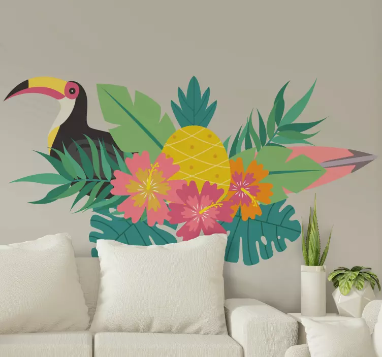 Referentienummer: A48101Met een levendige toekan te midden van weelderig groen, vangt dit ontwerp de essentie van een tropische sfeer. Een heldere ananas en kleurrijke bloemen voegen een levendige toets toe, waardoor een verfrissend beeld ontstaat dat perfect is om elke ruimte te verfraaien met een exotische flair.