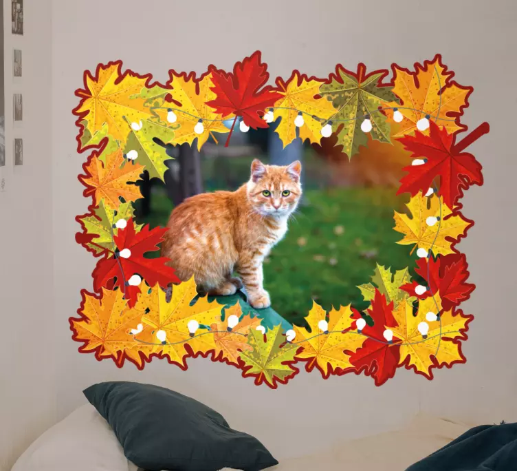 Breng de schoonheid van de natuur in uw interieur met onze Fotolijst sticker kat omringd door bladeren. Dit kleurrijke ontwerp, met een schattige kat omringd door levendige herfstbladeren, voegt een speelse en warme touch toe aan elke ruimte. De combinatie van herfstkleuren en de natuurlijke elementen creëert een harmonieus geheel dat perfect past in elk huis. Laat uw foto's stralen in dit unieke, op maat gemaakte kader dat de aandacht trekt en een glimlach op uw gezicht tovert!