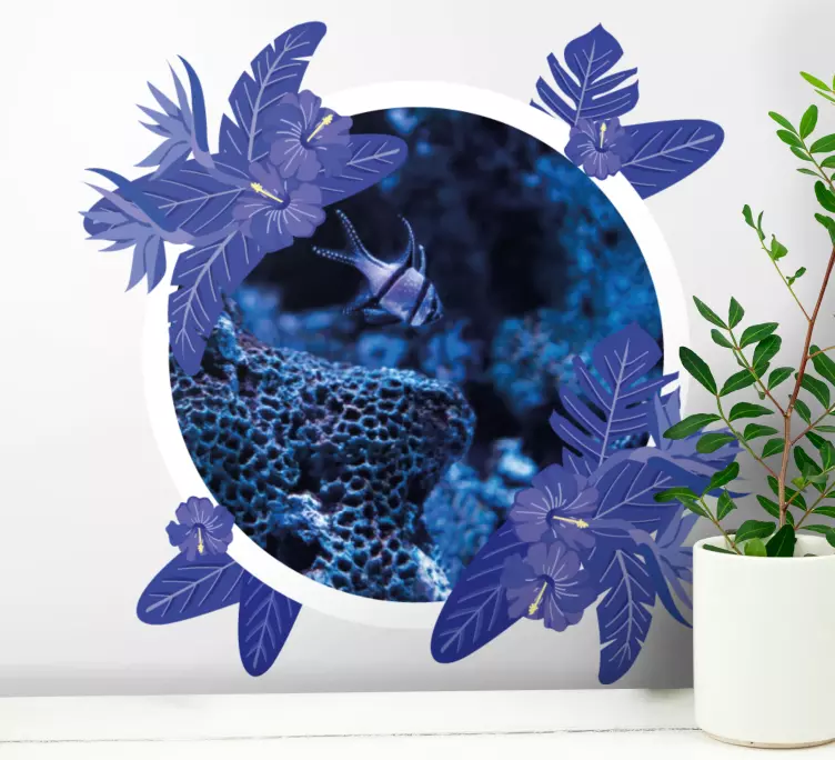 Maak je ruimte bijzonder met onze unieke Fotolijst sticker onderwater verkenningsscène. Dit prachtige ontwerp is een betoverende weergave van de oceaan, vol met kleurrijke bloemen, ronde kaders, en speelse vissen die samen een tropisch paradijs creëren. De natuur komt tot leven met levendige bladeren en een adembenemend koraalrif dat perfect in het blauw van de oceaan is geïntegreerd, waardoor het een visuele traktatie is voor elke ruimte.