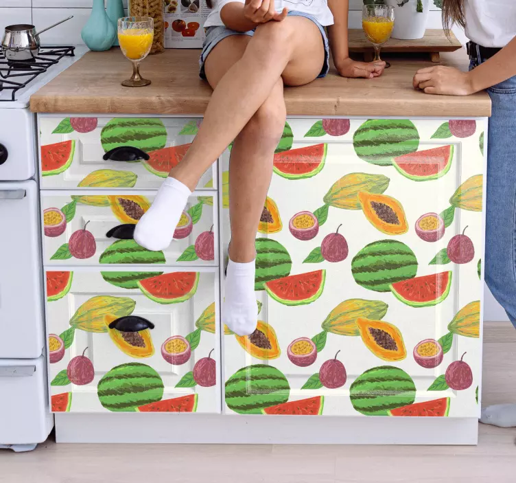 Ontdek de kleurrijke wereld van onze Fruit sticker fruit motief creatie! Dit unieke ontwerp bevat een vrolijk patroon met watermeloenen, papaja en citroen dat een tropische sfeer aan elk interieur toevoegt. De levendige kleuren en het speelse fruitmotief maken deze sticker perfect voor het opvrolijken van meubilair en andere oppervlakken. Met zijn satijnen afwerking zorgt het ervoor dat de kleuren optimaal tot hun recht komen zonder hinderlijke reflecties, zodat u volop kunt genieten van de schoonheid van het ontwerp!