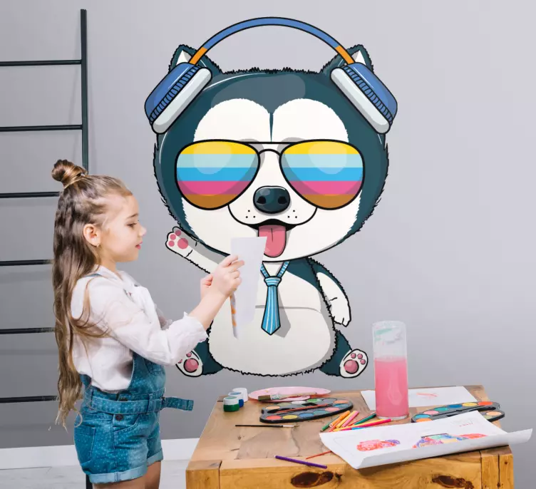Breng je ruimte tot leven met onze huisdier sticker coole huisdier karakter! Dit grafisch ontwerp bevat een schattige hond met een puppy die een zonnebril en koptelefoon draagt in een vrolijke cartoonstijl. De levendige kleuren en het speelse karakter zorgen voor een muzikale sfeer en plezier in je huis. Deze sticker is perfect voor elke dierenliefhebber die op zoek is naar een unieke manier om hun ruimte te versieren!