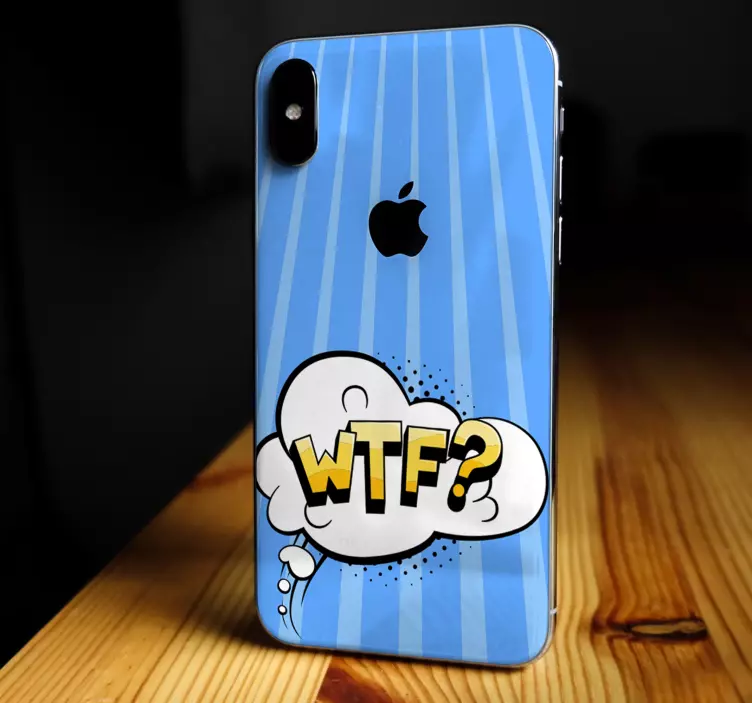 Referentienummer: A48535Een levendig ontwerp bevat een gedachtenwolk met de tekst 'WTF?'. De speelse typografie springt in het oog tegen een lichtblauwe achtergrond, versierd met verticale strepen, wat een moderne esthetiek creëert die persoonlijke expressie kan versterken.