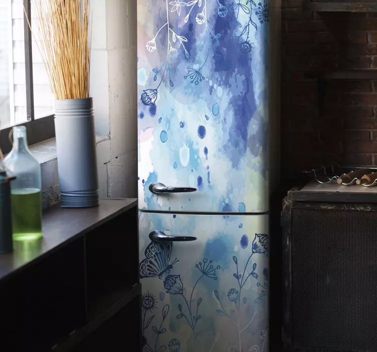 Breng kleur en leven in uw keuken met onze Koelkast sticker bloemig vlinder motief. Dit prachtige ontwerp combineert een blauw waterverfpalet met een speelse plons van bloemen en een delicate tekening van vlinders, waardoor het een echte eyecatcher is. De natuur komt tot leven op uw koelkast met dit kleurrijke ontwerp, perfect voor iedereen die van een frisse en vrolijke uitstraling houdt!