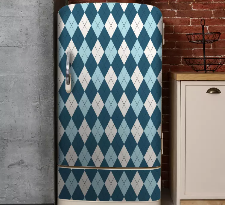 Geef je koelkast een stijlvolle upgrade met onze Koelkast sticker diamantpatroon wrap. Dit prachtige ontwerp met een geometrisch diamanten patroon in verschillende blauwe tinten voegt een elegante en moderne uitstraling toe aan je keuken. De ruit en ruiten vormen creëren een visueel spektakel dat een frisse sfeer zal brengen in je interieur.
