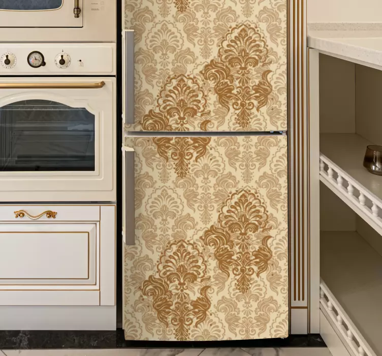 Breng een vleugje elegantie in uw keuken met onze Koelkast sticker elegant vintage patroon. Het versierde ontwerp met bloemen en ornamenten straalt een klassieke charme uit. De gouden details maken deze koelkast een pronkstuk in uw huis, terwijl het overladen patroon een rijke visuele ervaring biedt die niet te weerstaan is.