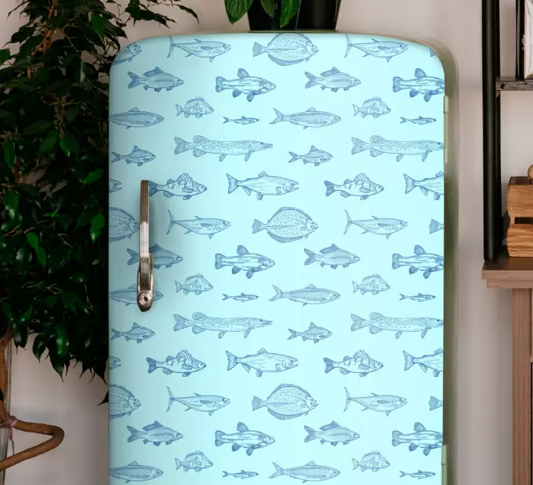 Breng de oceaan naar uw keuken met onze Koelkast sticker met waterpatroon ontwerp. Dit prachtige ontwerp toont een levendig blauw patroon met vissen en maritieme elementen die de schoonheid van het zeeleven vastleggen. De illustratie is een echte blikvanger die elke koelkast transformeert in een kunstwerk, perfect voor liefhebbers van de zee en natuurliefhebbers!