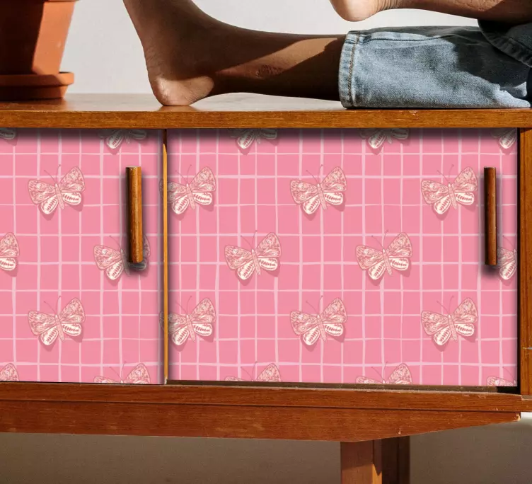 Breng een vleugje elegantie en kleur in uw keuken met onze prachtige koelkast sticker roze vlinderpatroon. Dit unieke ontwerp is een feest voor het oog en toont een betoverend patroon van vlinders die speels over een geruit achtergrond fladderen. De combinatie van roze tinten en decoratieve elementen maakt het een perfect stuk om uw meubilair te verfraaien en een warme, uitnodigende sfeer te creëren.