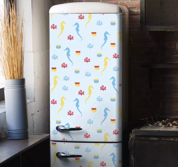 Met de Koelkast sticker speelse zeepaardjes patronen transformeert u uw koelkast in een kunstwerk. Deze unieke decoratie voegt niet alleen kleur en leven toe aan uw keuken, maar brengt ook een vleugje vrolijkheid in uw dagelijks leven. Het speelse ontwerp is perfect om een glimlach op uw gezicht te toveren, terwijl het tegelijkertijd een geweldige manier is om uw apparaat te personaliseren. Geef uw keuken een frisse, aquatische uitstraling die gasten zal verbazen!