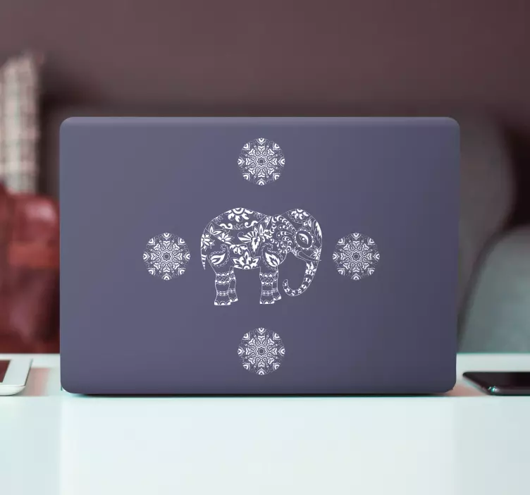 Referentienummer: A49562Een complexe voorstelling van een olifant omringd door decoratieve cirkelpatronen. Dit ontwerp combineert kunstzinnigheid met charme, waardoor het een unieke persoonlijkheid aan het laptopoppervlak geeft. De olifant symboliseert wijsheid en kracht, waardoor dit stuk zowel aantrekkelijk als betekenisvol is.