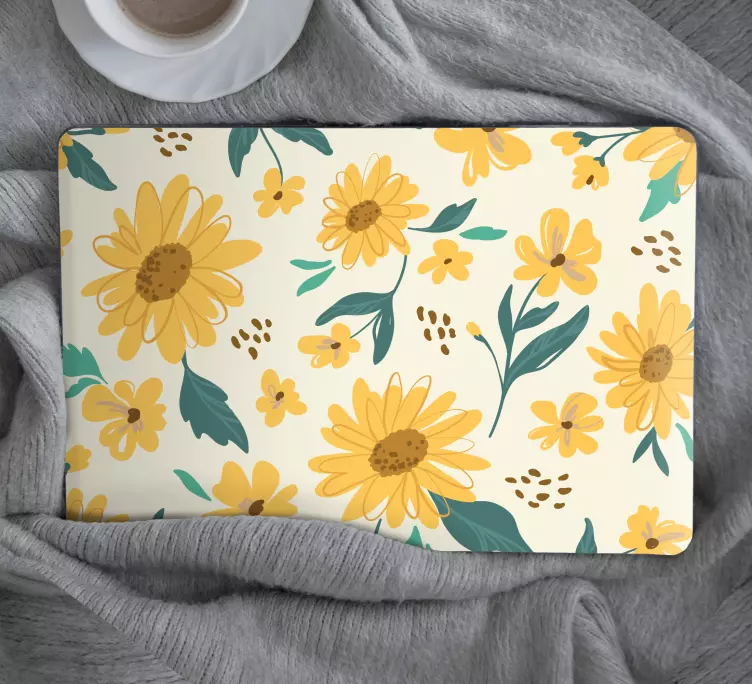 Breng kleur en vreugde in je leven met onze Laptop sticker vrolijk bloemenpatroon. Dit prachtig ontworpen product bevat een schitterende illustratie van zonnebloemen en andere bloemen in een levendig geel dat de natuur tot leven brengt. Het vrolijke ontwerp geeft je laptop een frisse uitstraling en maakt elke werk- of studeerplek een stukje gezelliger!