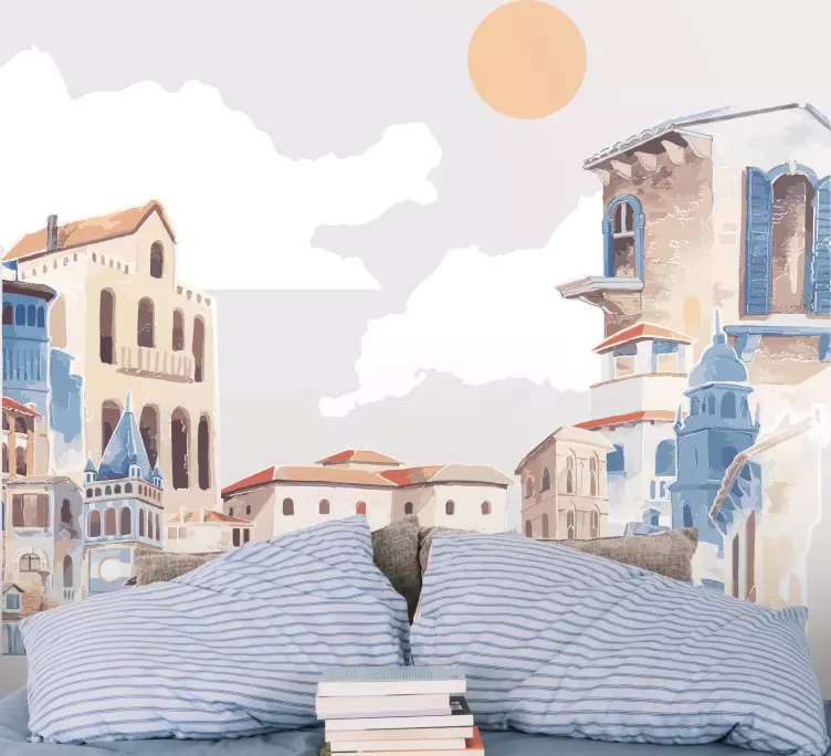 Breng een vleugje magie in uw interieur met onze Locatie sticker charmant stedelijk landschap. Dit prachtige ontwerp toont een schilderachtig dorp met charmante gebouwen, een stadsgezicht dat is gevangen in waterverf en aangevuld met warme blauwe tonen die de zon weerspiegelen. Het is een visuele traktatie die de schoonheid van architectuur en natuur naadloos samenbrengt.