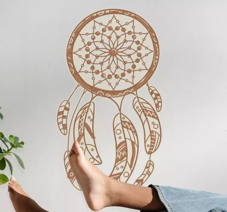 Laat je betoveren door ons Locatie sticker gedetailleerd droomvanger ontwerp, een prachtig grafisch ontwerp dat de essentie van een dromenvanger vastlegt. Met zijn beige tinten en ingewikkelde details brengt deze sticker een bohemien en spirituele sfeer in je huisdecoratie. De veren in het ontwerp zijn niet alleen artistiek, maar symboliseren ook de veerkracht van dromen en wensen.