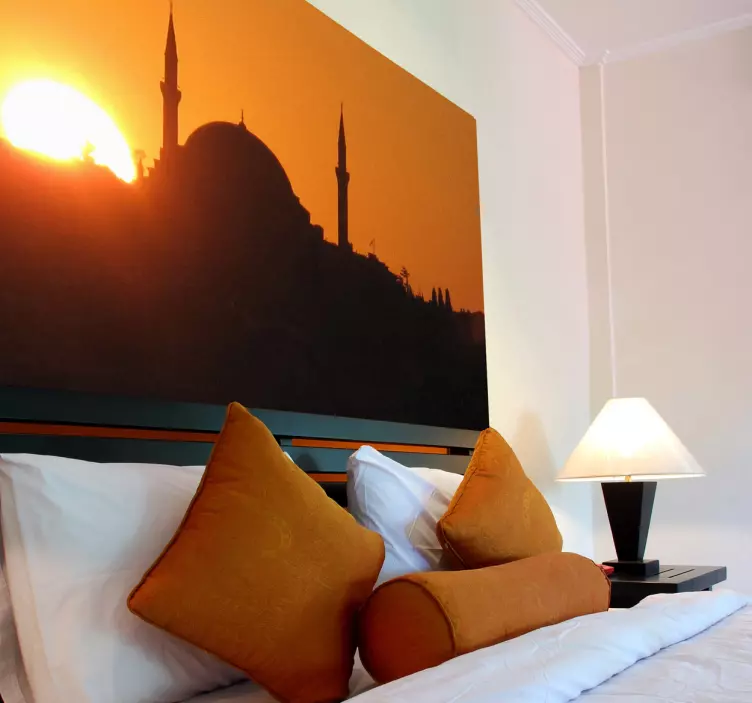 Breng de betoverende schoonheid van Istanbul in uw huis met onze Locatie sticker istanbul zonsondergang silhouet. Dit unieke ontwerp vangt de magie van een zonsondergang, met silhouetten van prachtige minaretten en een adembenemend stadsgezicht dat de rijke architectuur en religieuze mijlpalen van deze iconische stad weerspiegelt. Laat de warme kleuren van de zonsondergang en de elegante vormen van de moskeeën uw interieur verfraaien, en creëer een serene sfeer vol cultuur en geschiedenis.