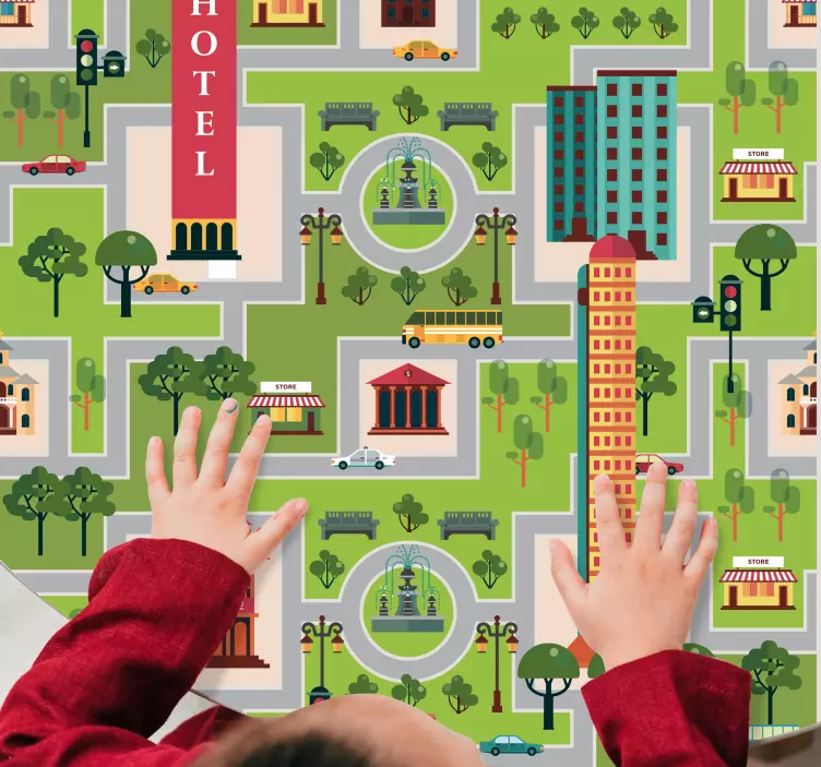 Referentienummer: A49463Een levendige stadskaart met ingewikkelde details zoals gebouwen, bomen, winkels en voertuigen. Het toont verschillende bezienswaardigheden, waaronder een hotel en een fontein, en moedigt fantasierijk spel en verkenning aan voor kinderen, waardoor een boeiende en interactieve ervaring ontstaat.
