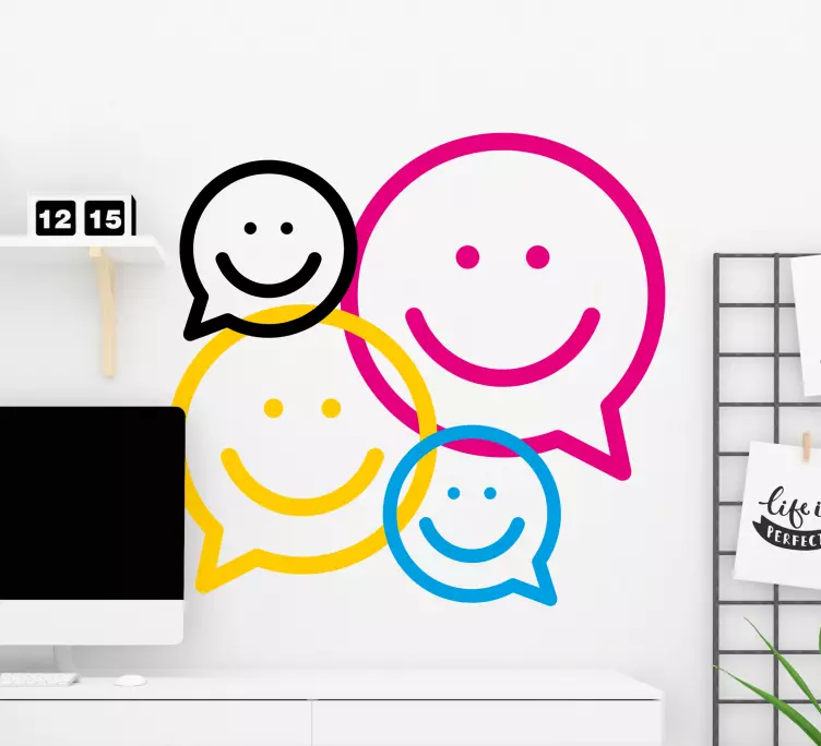 Referentienummer: A49042Een speelse schikking van smiley-gezichten in verschillende maten en kleuren vertegenwoordigt vreugde en communicatie. Deze vrolijke iconen, gestileerd met spraakbubbels, roepen emoties op en creëren een levendige sfeer, perfect voor ruimtes die positiviteit willen inspireren.