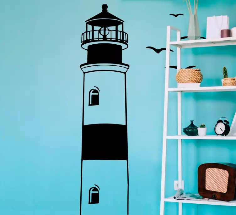 De Locatie sticker vuurtoren silhouet is een prachtig ontworpen decoratief element dat de schoonheid van een vuurtoren vastlegt, omringd door elegante vogels die door de lucht zweven. Dit nautische silhouet brengt een gevoel van rust en avontuur in uw interieur, perfect voor elke kustliefhebber die zijn huisdecoratie wil verfraaien met een vleugje maritieme charme.