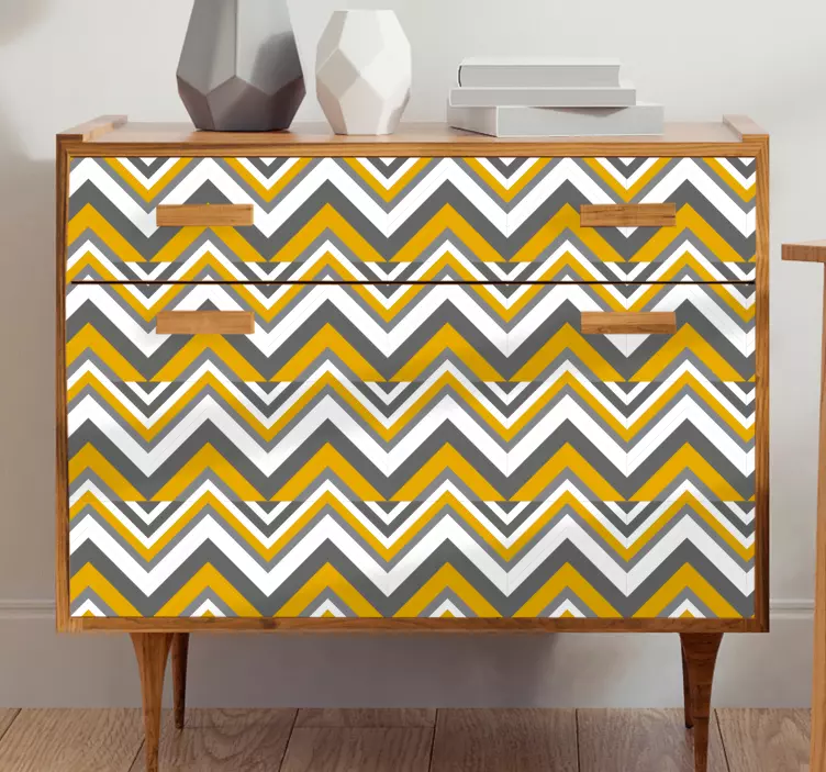 Breng een moderne uitstraling in uw interieur met onze Meubel sticker chevron overlay. Dit unieke ontwerp bevat een geometrisch patroon met zigzag en driehoeken in een stijlvolle combinatie van geel en grijs. Het noords geïnspireerde design voegt een eigentijdse flair toe aan elk meubelstuk, waardoor het de perfecte keuze is voor iedereen die zijn of haar ruimte wil verfraaien!