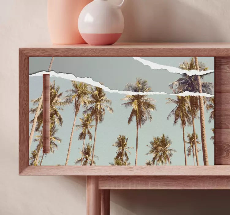 Breng een vleugje tropisch paradijs in uw huis met onze Meubel sticker tropisch palm uitzicht. Dit prachtige ontwerp, dat palmboom en handpalmen prachtig vastlegt op een stuk gescheurd papier, creëert een natuurgetrouwe en vredevolle sfeer die elke ruimte verlevendigt. De palmbomen lijken bijna te dansen in de wind, en het geheel geeft een gevoel van rust en harmonie.