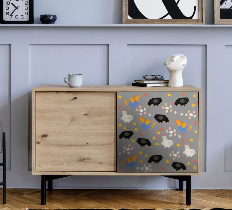 Referentienummer: A52348Een levendige compositie met verschillende boerderijdieren, waaronder kleurrijke kippen en zwarte hennen, verspreid over een lichte achtergrond. Dit speelse ontwerp brengt een vrolijke sfeer, perfect om charme toe te voegen aan elke ruimte.