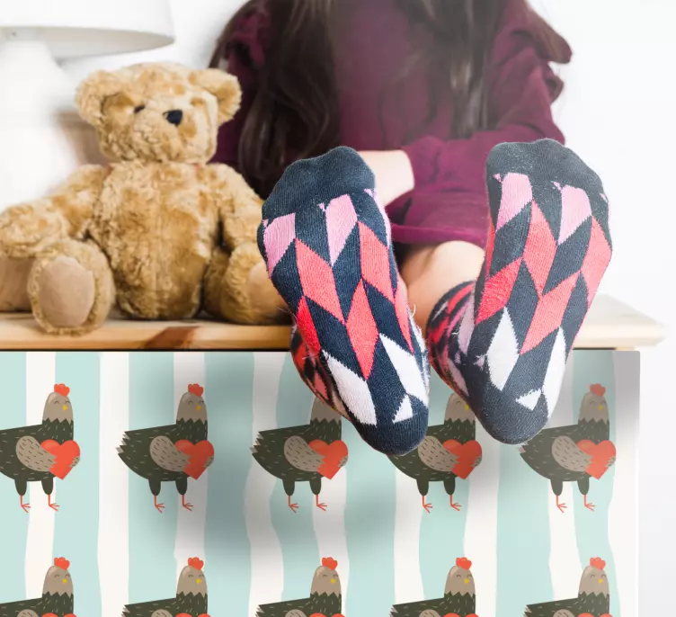 Breng de charme van het platteland in uw huis met onze Muursticker boerderijdieren schattig kippatroon. Dit sprankelende ontwerp bevat een vrolijke haan, schattige kippen, en een scala aan harten en strepen die samen een kleurrijk en speels patroon vormen dat perfect is voor elke kinderkamer of boerderijthema. Laat uw meubels stralen met deze unieke decoratie die een glimlach op ieders gezicht tovert!