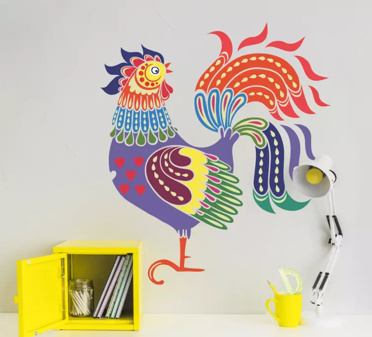 Referentienummer: A53794Een levendige haanontwerp met ingewikkelde patronen en felle kleuren. Deze charmante afbeelding vangt de essentie van het boerenleven en roept een gevoel van warmte en vreugde op. De dynamische schikking van kleuren benadrukt het speelse karakter, waardoor het een heerlijke toevoeging is om elke ruimte te verfraaien.