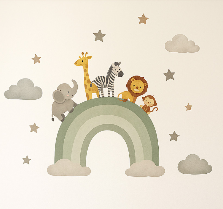Referentienummer: A54150Breng een vleugje magie in de kinderkamer met onze Muursticker kinderkamer dieren coole regenboog avonturen. Dit prachtige ontwerp, met levendige kleuren en schattige dieren, zorgt voor een speelse en uitnodigende sfeer. De combinatie van een satijnen afwerking en uitstekende kleurintensiteit maakt deze sticker een echte blikvanger, zonder vervelende reflecties van het licht. Uw kinderen zullen dol zijn op de vrolijke regenboog en de avontuurlijke dieren die hun kamer transformeren in een fantasiewereld!