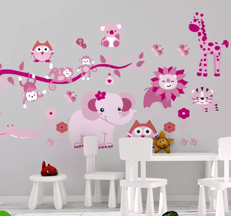 Breng een speelse sfeer in de kinderkamer met onze Muursticker kinderkamer schattige wezens verzameling. Dit kleurrijke ontwerp vol schattige dieren uit de jungle zorgt voor een vrolijke en grillige uitstraling. De illustraties zijn perfect voor kinderen en maken de kamer niet alleen decoratief, maar ook een plek vol fantasie en avontuur. De combinatie van roze tinten en cartoonachtige afbeeldingen maakt het geheel onweerstaanbaar!