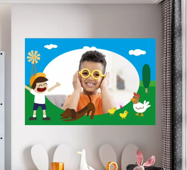 Breng kleur en vreugde in de kinderkamer met onze Muursticker kinderkamer speelse boerderij scène. Dit ontwerp is een vrolijke en kleurrijke afbeelding die de fantasie van elk kind prikkelt. Met schattige tekenfilmachtige dieren en een speelse boerderijsetting creëert deze muursticker een unieke sfeer. Het kader van de afbeelding zorgt ervoor dat het perfect in de kinderkamer past, waardoor het elke ruimte opvrolijkt. Laat kinderen genieten van plezierige momenten in hun eigen boerderijwereld!