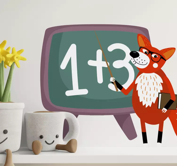 Referentienummer: A50989Een charmante vosfiguur staat naast een krijtbord en leert speels een eenvoudige wiskunde vergelijking. Dit aantrekkelijke ontwerp bevat levendige kleuren die gericht zijn op het creëren van een leuke leeromgeving, perfect voor kinderruimtes. De vos, uitgerust met een aanwijzer en een boek, nodigt nieuwsgierigheid en enthousiasme uit bij jonge leerlingen.