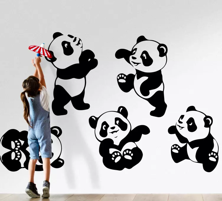 Referentienummer: A48530Een speelse opstelling met verschillende panda-personages in charmante poses. Het ontwerp benadrukt de onschuld en vreugde van de kindertijd, waardoor het perfect is voor een kinderruimte. Elke panda weerspiegelt een gevoel van plezier en avontuur, wat de verbeelding en creativiteit aanmoedigt.