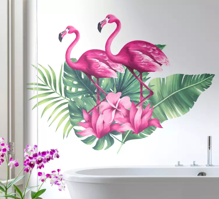 Breng een vleugje tropische sfeer in uw huis met onze prachtige Muursticker vogels flamingo's en bladeren. Dit unieke ontwerp toont een betoverende combinatie van flamingo's, tropische bladeren, en kleurrijke bloemen, waardoor het een ideale keuze is voor natuurliefhebbers. De vrolijke roze flamingo's dansen tussen de groene bladeren, waardoor een levendige uitstraling ontstaat die elke ruimte opfleurt.