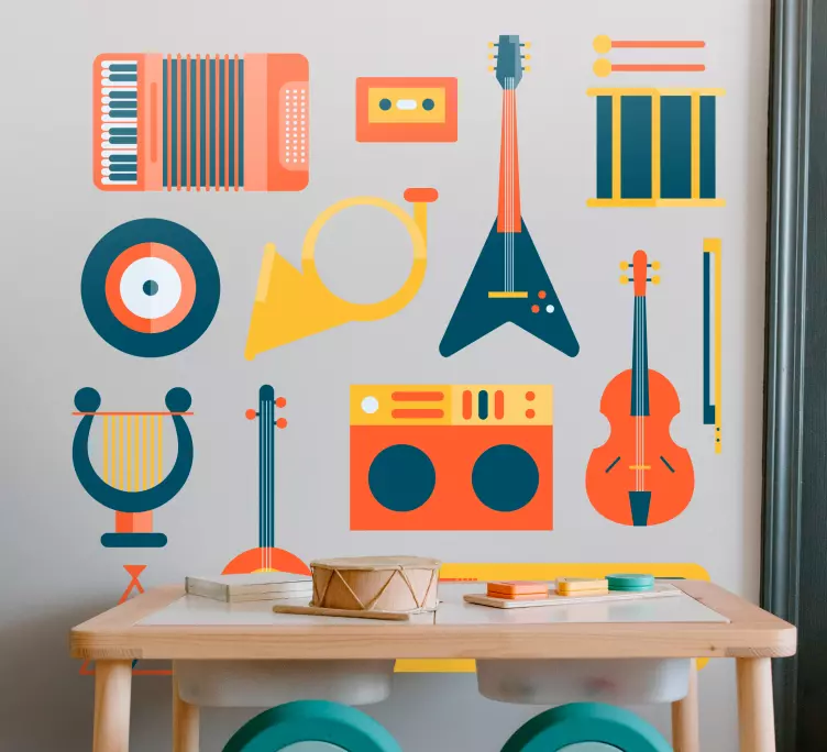 Breng kleur en leven in uw ruimte met onze Muziek sticker levendige muziekinstrumenten. Deze prachtige decoratie is een ware kunstzinnige expressie van de wereld van muziek, met muzikale elementen die uw muren sieren. De set bestaat uit een assortiment instrumenten die op een decoratieve manier zijn afgebeeld, en de kleurigheid van de ontwerpen maakt ze perfect voor elke muziekliefhebber!