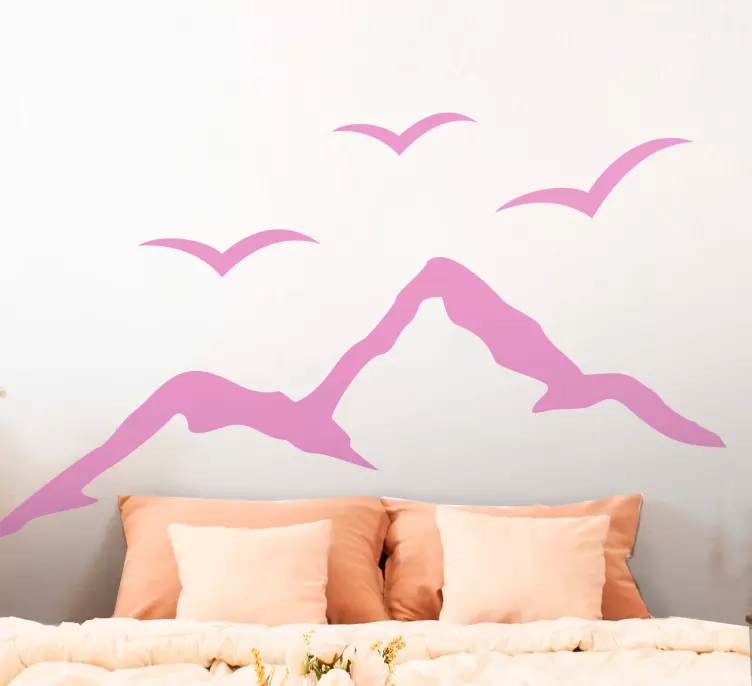Referentienummer: A48502Stijlvolle bergsilhouet gecombineerd met vliegende vogels creëert een serene sfeer. Dit ontwerp benadrukt de schoonheid van de natuur, ideaal om rust in woonruimtes te bevorderen. De minimalistische stijl zorgt ervoor dat het verschillende decoratiethema's aanvult.