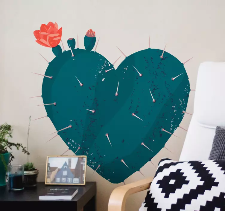 Deze prachtige natuur muursticker hartvormige cactus is een betoverende illustratie van een schattige cactus in een hartvorm. De combinatie van doornen en vrolijke roze bloemen geeft een frisse uitstraling die perfect past in elk interieur. Laat je omringen door de natuur met deze unieke muursticker die jouw ruimte een levendige en uitnodigende sfeer geeft!