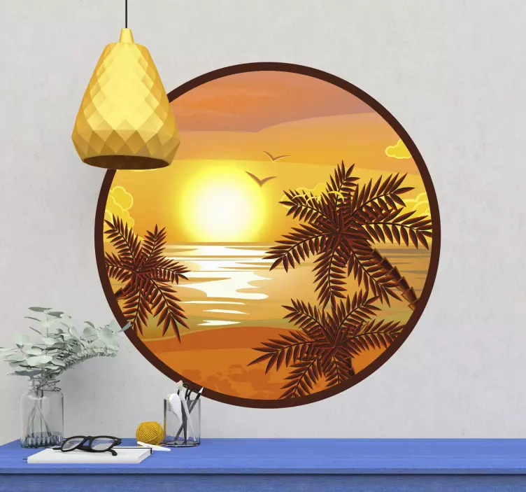 Transformeer uw ruimte met de Natuur muursticker serene zonsondergang uitzicht, een prachtig ontwerp dat de schoonheid van de natuur naar binnen haalt. Dit visueel verbluffende ontwerp toont een serene zonsondergang met palmbomen die zachtjes wiegen in de tropische bries, terwijl de oceaan rustig tegen het strand aanklust. De cirkelvormige elementen van deze muursticker creëren een dromerige sfeer die elke kamer in uw huis kan verfraaien. Maak van uw muren een betoverende oase waar u tot rust kunt komen en genieten van de natuurlijke schoonheid om u heen!
