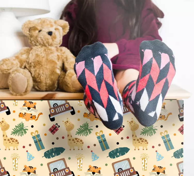 Referentienummer: A51645Een speelse collectie benadrukt speelse safari-elementen, met giraffen, tijgers en kleurrijke cadeaus. Dit ontwerp versterkt de speelse geest van een kind met zijn levendige weergave van een leuk, avontuurlijk thema dat perfect is voor levendige ruimtes.