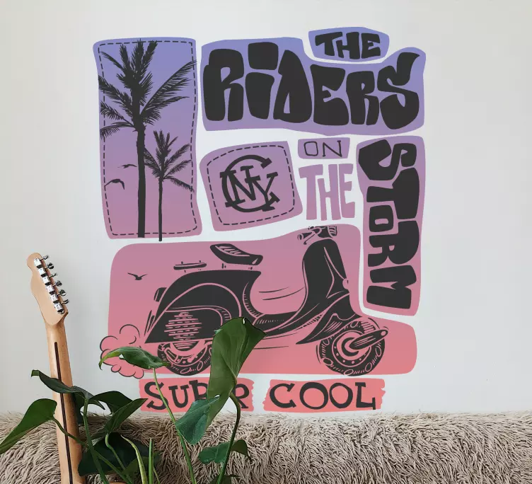 Referentienummer: A48088Deze combinatie van een klassieke scooter met palmbomen geeft een retro gevoel. De speelse typografie voegt een informele toets toe, wat een ontspannen levensstijl suggereert. Perfect voor degenen die vintage esthetiek waarderen en de vreugde van het verkennen van nieuwe straten.