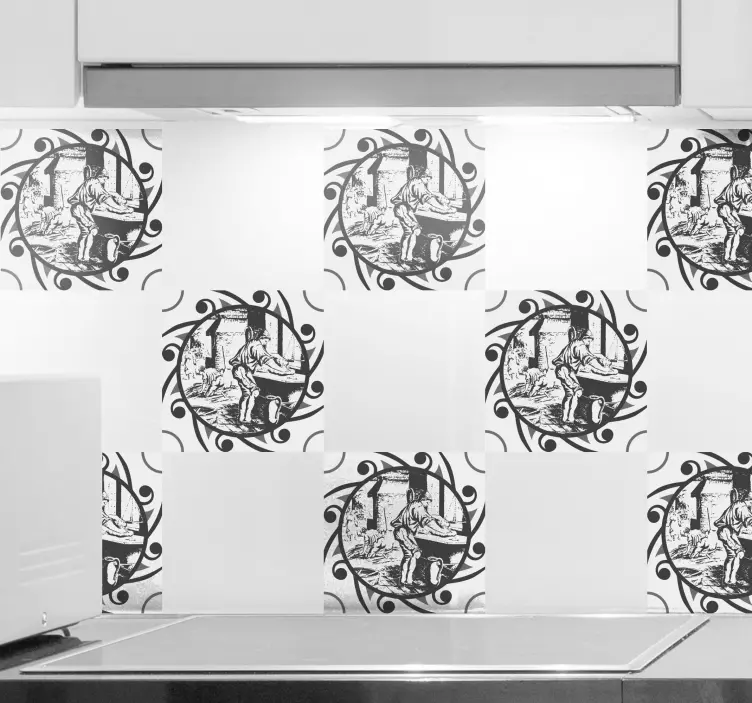 Referentienummer: A52160Dit ontwerp toont een vintage ambachtscene, met een ambachtsman die ijverig aan een tafel werkt, omringd door sierlijke decoratieve elementen. De ingewikkelde details roepen een gevoel van nostalgie en kunstzinnigheid op, waardoor het een opvallende aanvulling is voor elke ruimte.