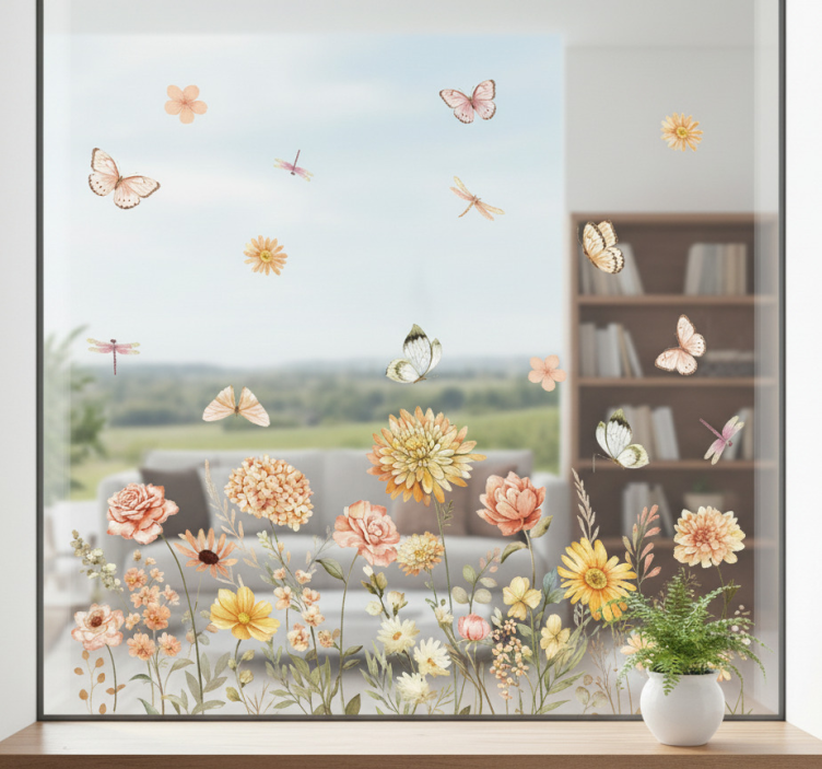 Met de Raamsticker bloemenweide met vlinders raamsticker maak je van elk raam een blikvanger. Deze sticker voegt niet alleen kleur en leven toe aan je interieur, maar biedt ook privacy door het zicht van buitenaf te blokkeren zonder het binnenkomende licht te belemmeren. Transformeer je ruimte en laat je gasten zich verwonderen!