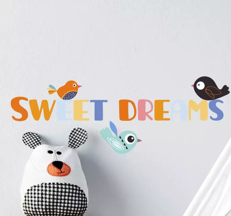 Referentienummer: A51016Een levendige weergave met vrolijke vogels die een speelse zin sieren die een boodschap van vredige slaap overbrengt. Perfect om de ruimte van een kind op te fleuren, de combinatie van kleuren en personages voegt een speelse toets toe aan elke kamer.