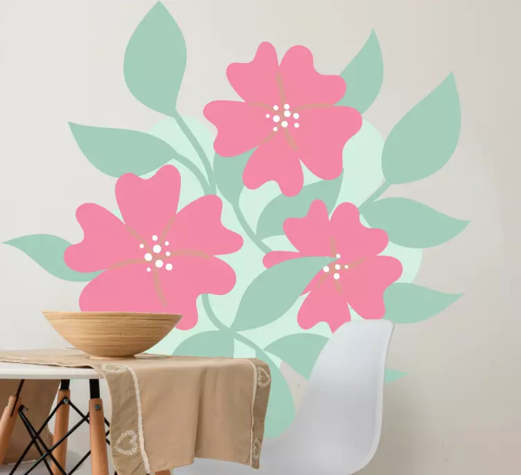 Referentienummer: A48129Een levendige compositie met delicate roze bloemen omringd door weelderig groene bladeren. Dit frisse ontwerp voegt een vleugje natuur toe aan elke ruimte en bevordert een vrolijke en uitnodigende sfeer.