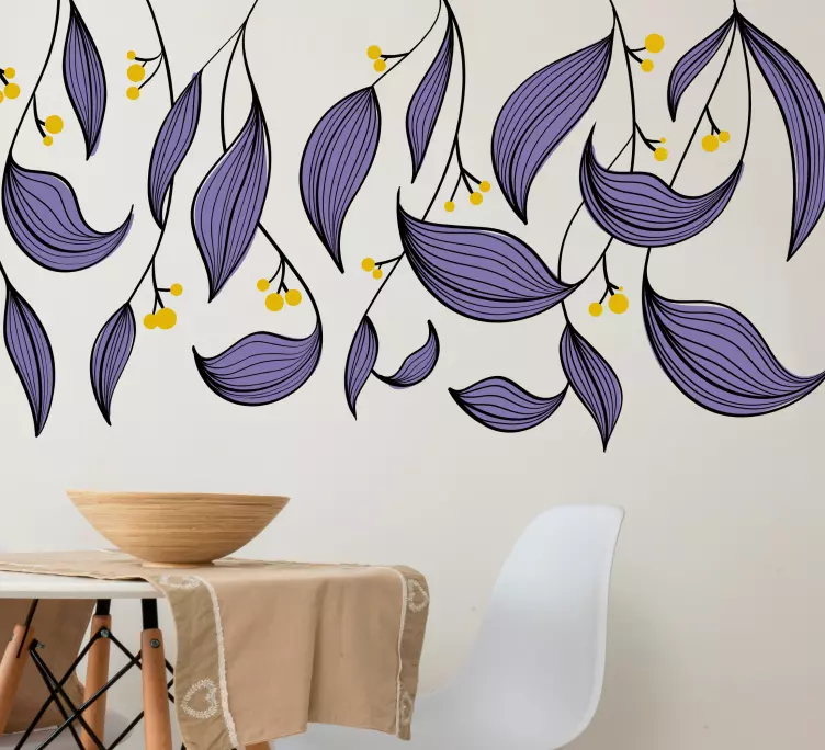Referentienummer: A48215Stijlvolle paarse bladeren versierd met gele accenten creëren een elegante compositie. De ingewikkelde verstrengeling van bladeren geeft een frisse en levendige sfeer, waardoor het een perfecte keuze is om leefruimtes te verfraaien. Dit ontwerp voegt een vleugje natuur toe zonder de omgeving te overweldigen.