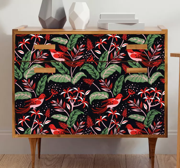 Breng een vleugje tropische magie in uw ruimte met onze Sticker bloemen en planten tropisch bloemconcept. Dit kleurrijke ontwerp omarmt de schoonheid van de natuur met levendige bladeren, speelse vogels en prachtige bloemen die harmonieus samenkomen. De rijke rode en groene tinten creëren een sprankelend patroon dat elk meubilair en elke muur transformeert in een oase van tropische charme.
