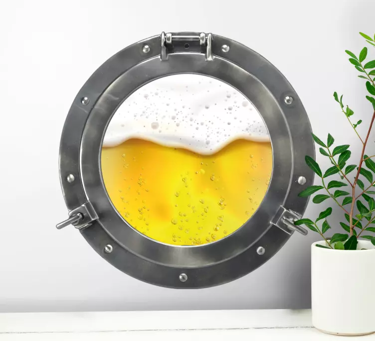 Referentienummer: A49056Een creatieve afbeelding die een porthole toont gevuld met een verfrissend gouden drankje. Het ontwerp vangt de essentie van een levendige sfeer, waardoor het perfect is voor keukens of bars. De schuimige bovenkant en sprankelende bubbels brengen een vleugje opwinding in elke ruimte.